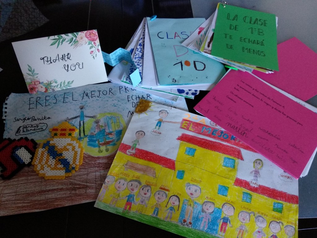 Este curso además hay otras circunstancias que lo hacen especial: niños que esperan a la salida de clase para darme papelitos doblados y escritos con manos temblorosas en las que me cuentan sus emociones; alumnos que me piden por favor que haga asamblea en círculo el último día de mi clase porque quieren que yo conozca de primera mano cómo se sienten; pequeños que plasman toda su creatividad en un folio en el que me representan y se representan a ellos mismos, con amplias sonrisas disfrutando de la clase; complots para que al grito de “ahora”, me rodeen y me den un inesperado abrazo grupal, dejándome una sensación de profunda gratitud hacia ellos; gratitud por haber formado parte de sus vidas; gratitud por recibir muchísimo más de lo que di; gratitud por tener la posibilidad de ejercer esta profesión.
